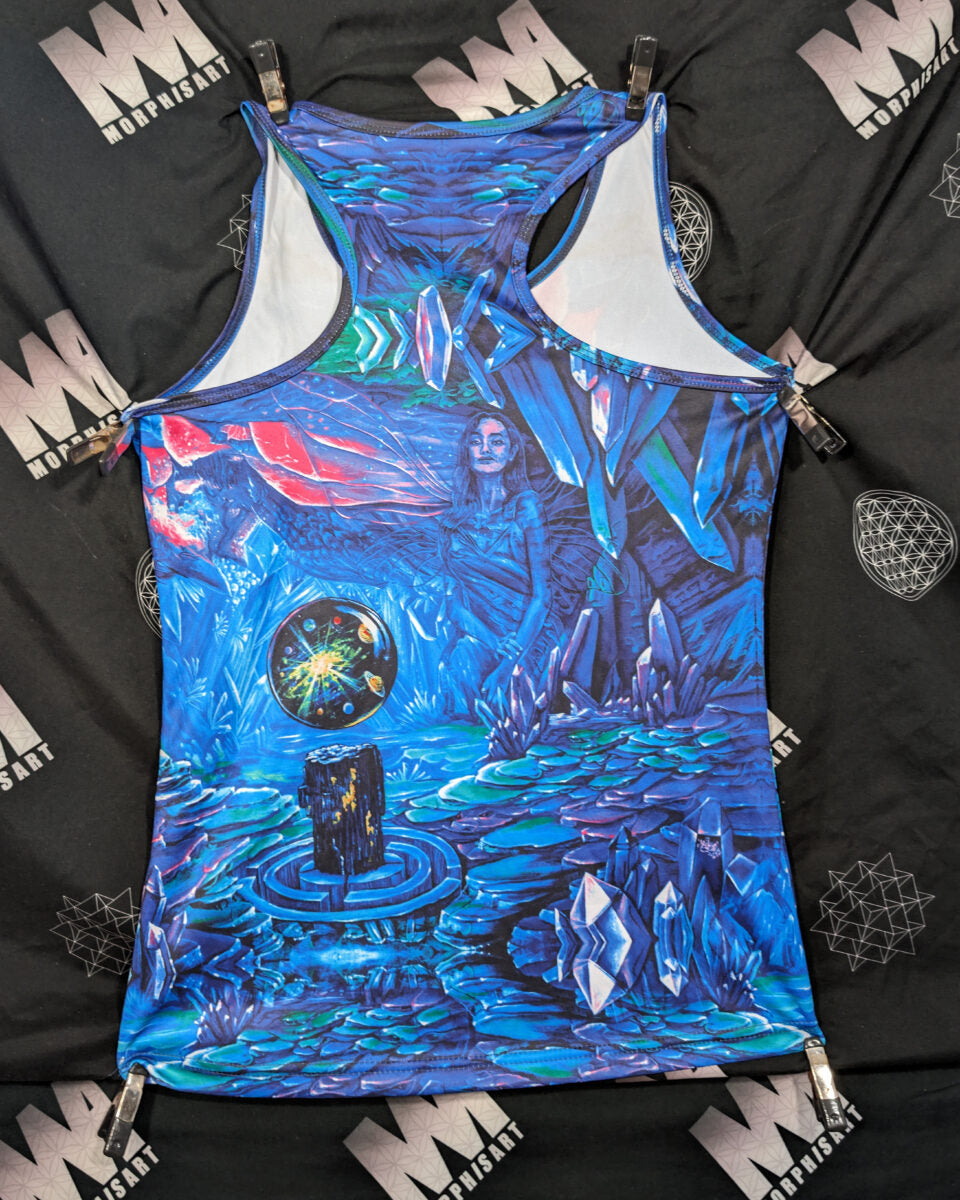 Betreten Sie ein Reich mystischer Eleganz mit unserem längeren, figurbetonten Tanktop im faszinierenden Design „ Crystal Caverns Goddess “.