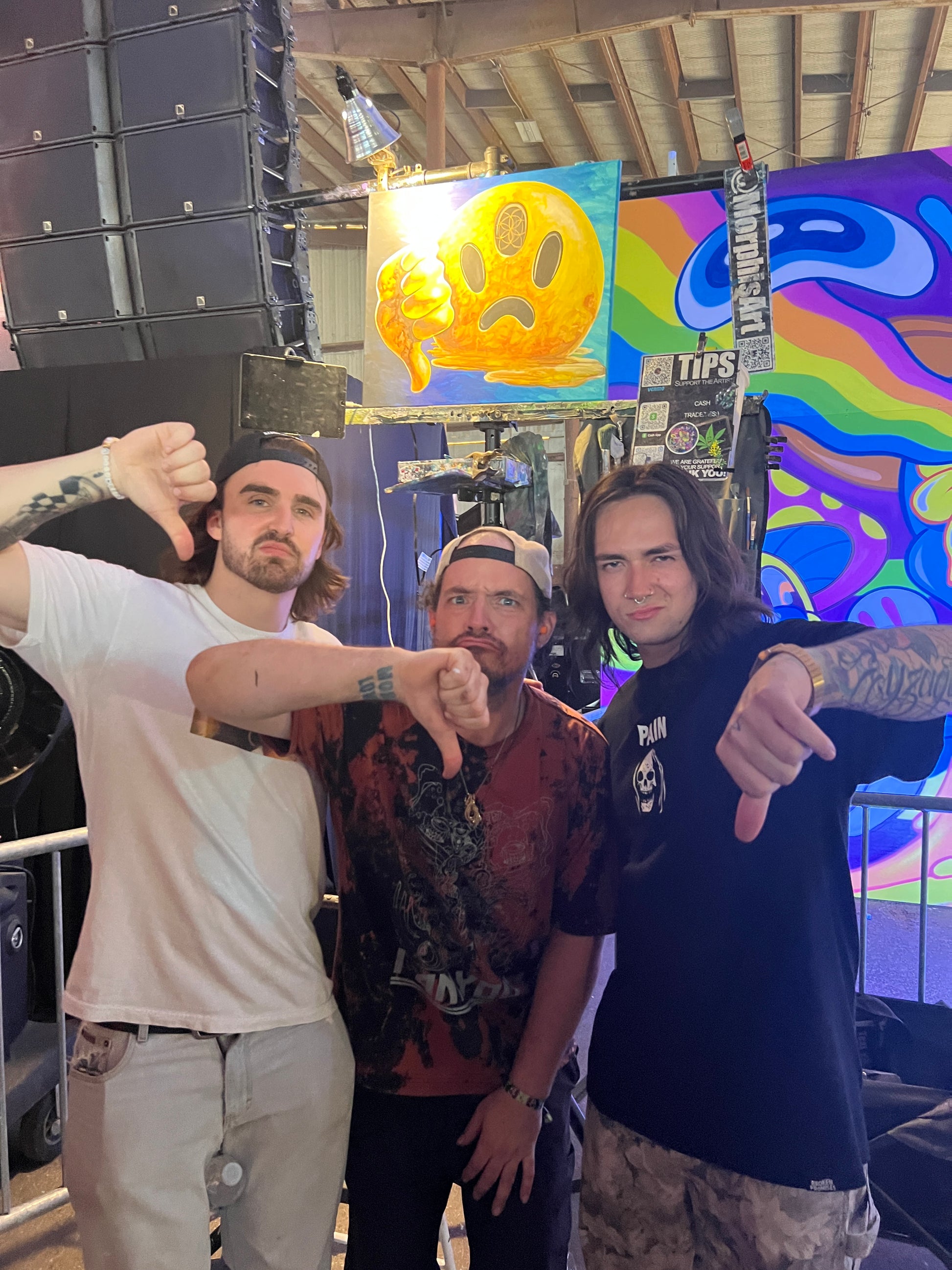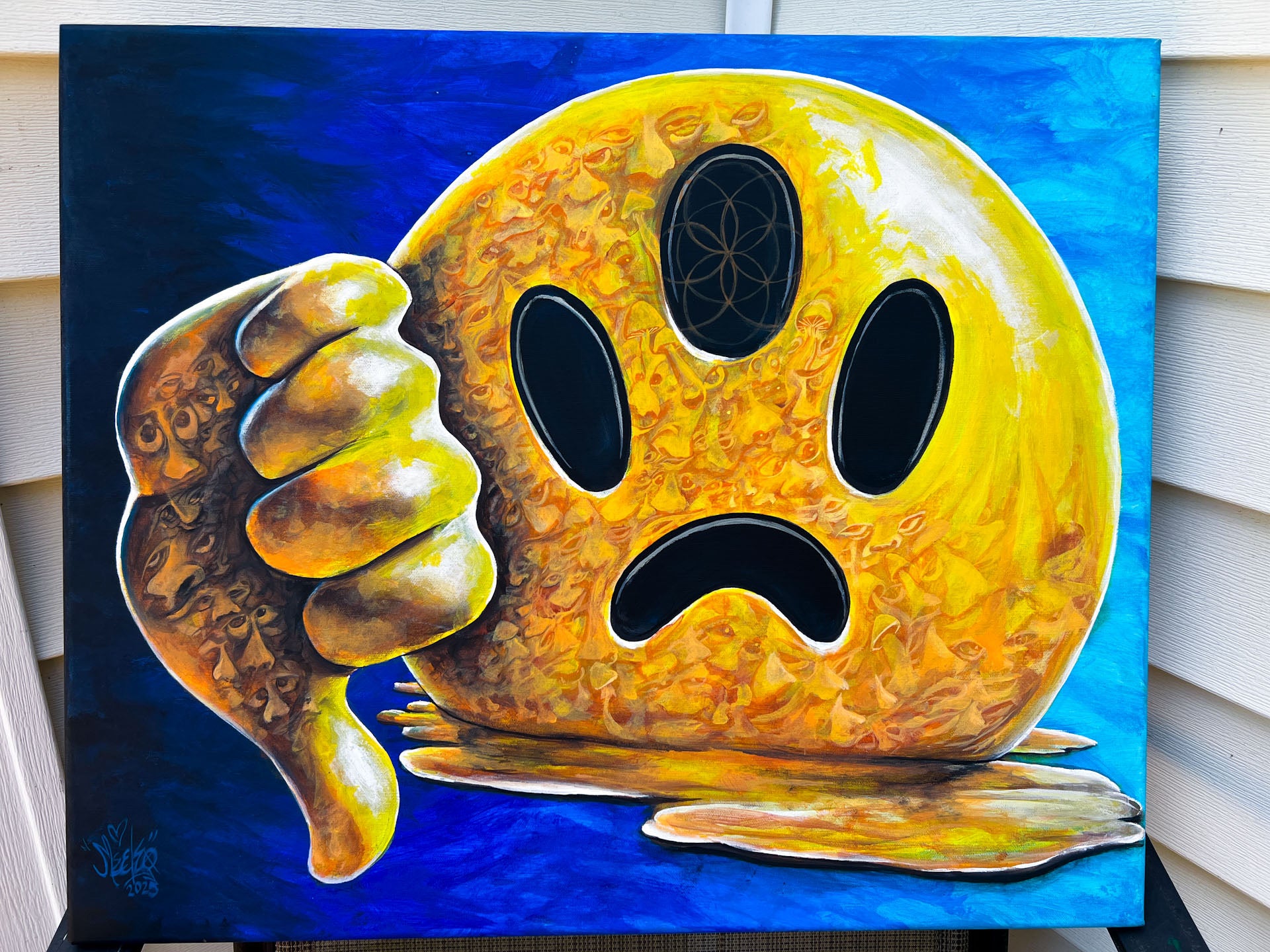 Painted live at Ill Fest as a tribute to Houston-based duo KNOW Good, whose music and art I’ve admired for years. Their signature “thumbs down” emoji character gets a surreal 3D twist here — melting, golden, and alive with hidden faces and mushrooms embedded in its form. The forehead features a third eye with sacred geometry radiating from within, symbolizing deeper vision beyond surface emotion. The deep blue and aqua background amplifies the character’s vibrant gold, while the melting edges blur the line between solid form and fluid thought.