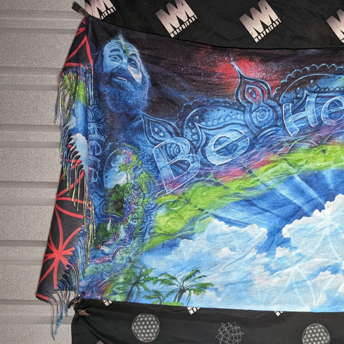 - Doppelseitige Sublimationskunst : Diese Pashmina präsentiert sich in einem Doppeldesign und zeigt die Schönheit des vollständigen Sublimationsdrucks auf beiden Seiten. Eine Seite zeigt das inspirierende Motiv „Be Here Now“, eine Anspielung auf Ram Dass‘ einflussreiche Arbeit, während die Rückseite ein ergänzendes Muster bietet, das die Optik und Vielseitigkeit des Tuchs erhöht.