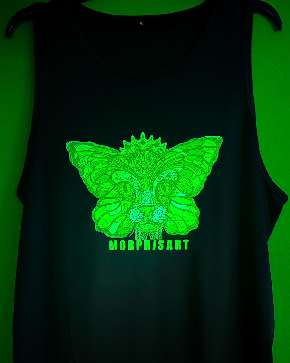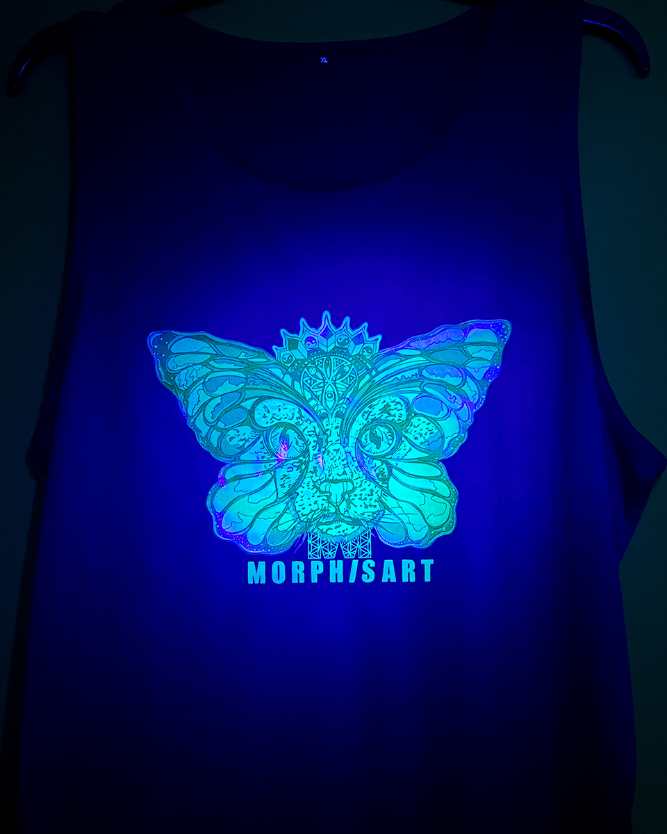 - Im Siebdruckverfahren hergestellt mit einer SPEZIELL neuen, UV-/Schwarzlicht-reaktiven und im Dunkeln leuchtenden Tinte !