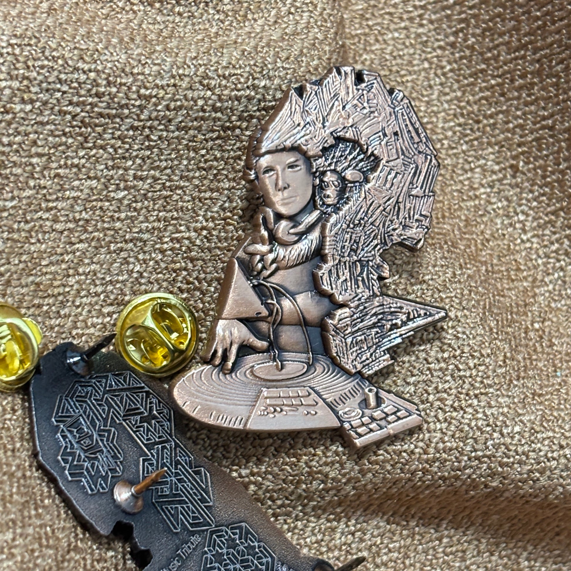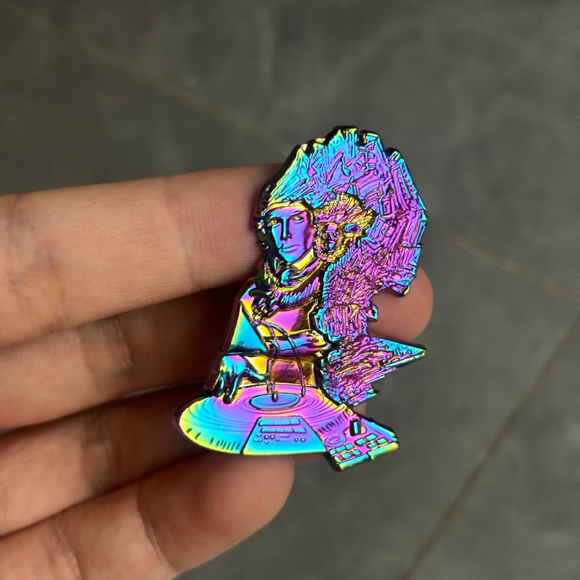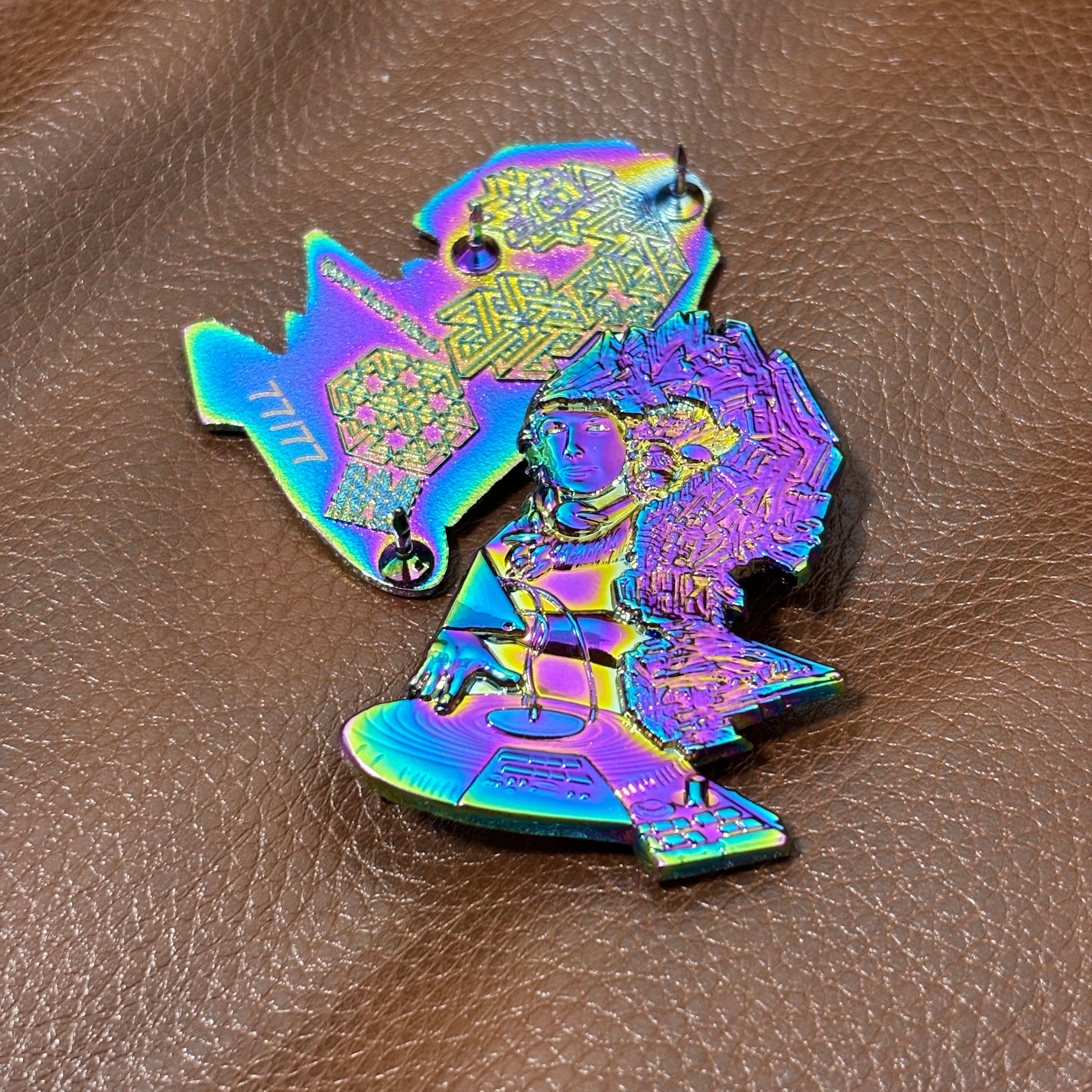 This 3D pin brings that vision to life in full dimensional glory. His head blossoms into fractal stacks of sound, interwoven with sacred geometry and sonic madness. Each pin is 5 cm tall, 3mm thick, and crafted in ten stunning limited edition variants, ranging from Anodized Metal to Polished Gold, Copper, Red, Blue, and beyond.