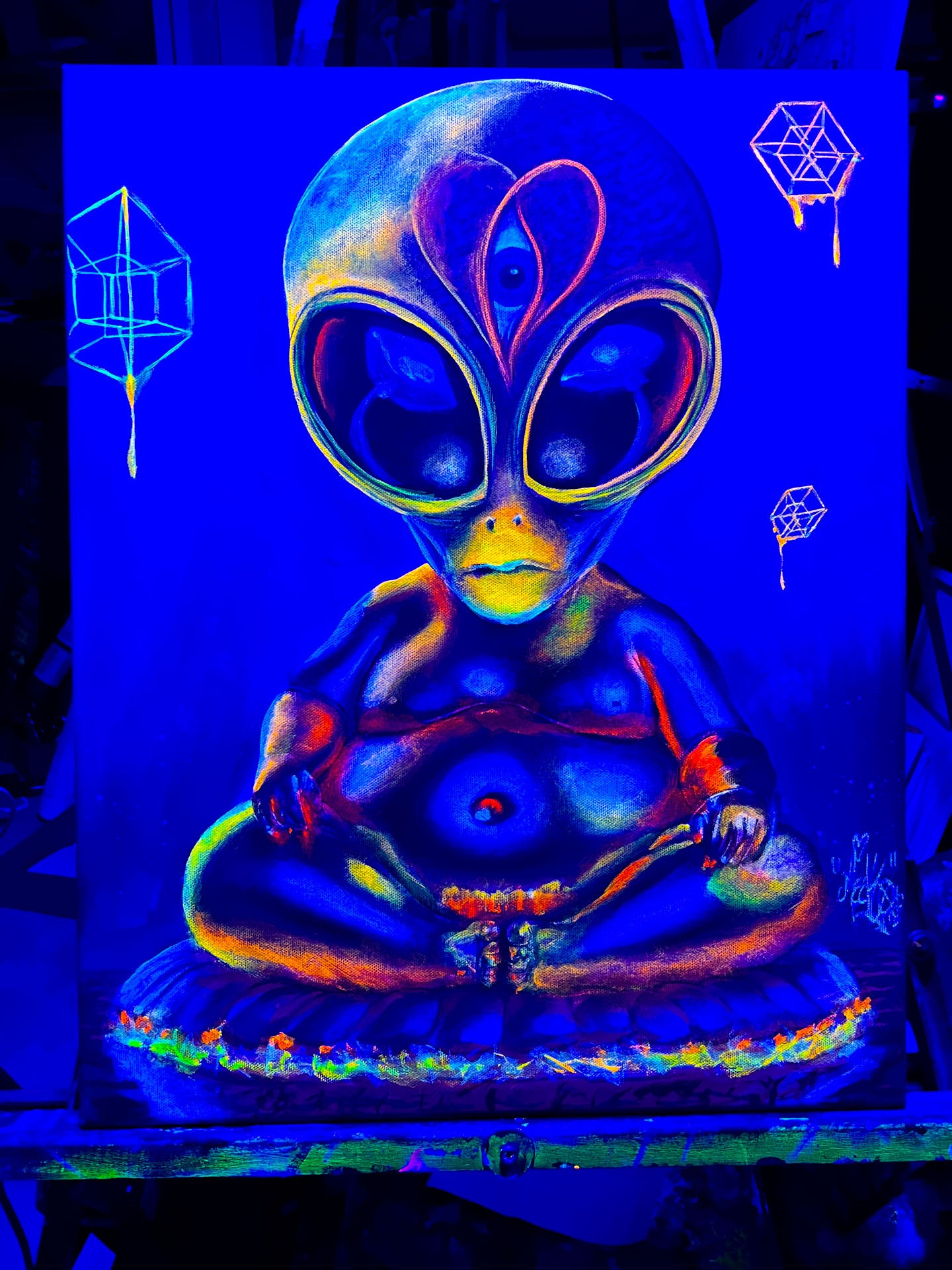I painted this 16x20 acrylic on canvas live at Sound Haven Festival, letting the music pull this golden alien sage into existence. Later, in the stillness of my studio, I wove in blacklight-reactive magic—revealing a second, hidden life that only glows when the ultraviolet sun rises.